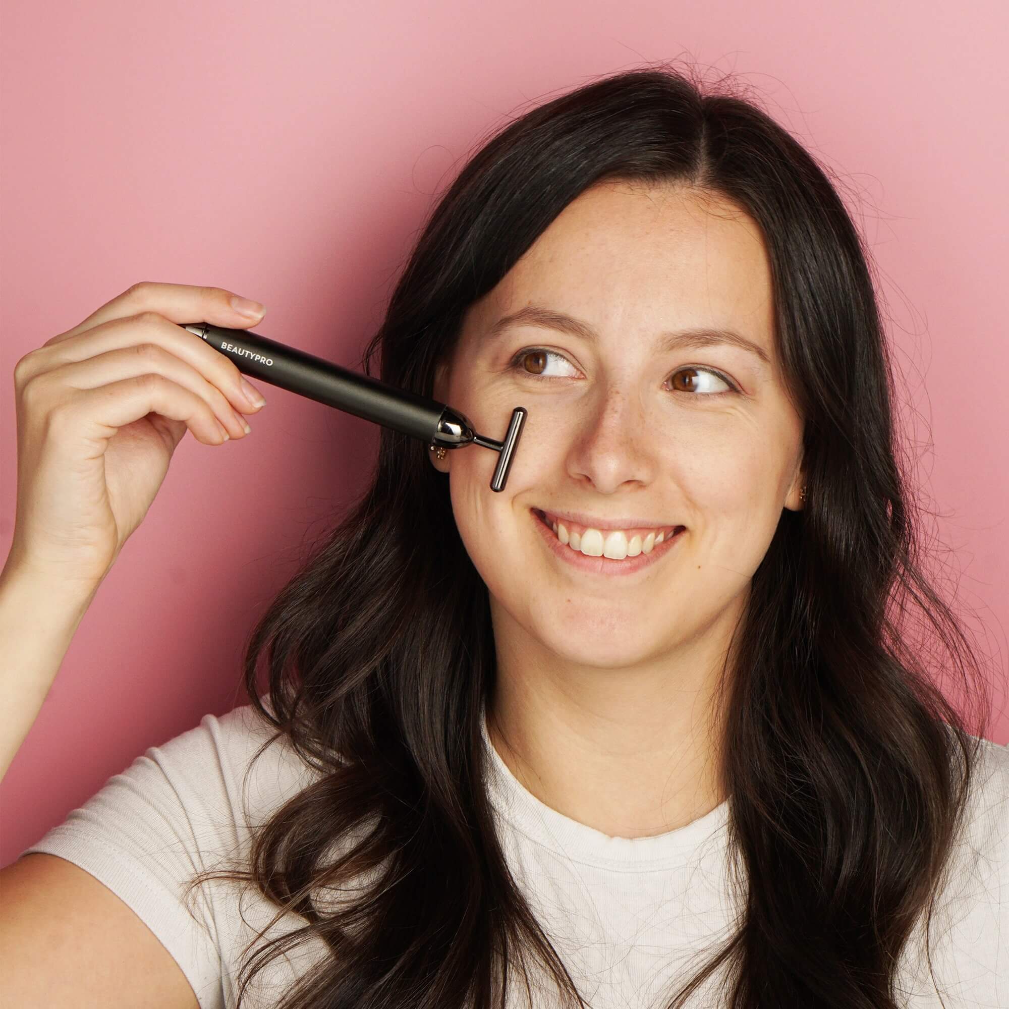 Once activated, gently move the T-Bar in an upward motion on your forehead in small strokes. Massage your face from the centre outwards towards the ears. Massage downwards from behind the ears through the sides of the neck. This will help to aid lymphatic drainage to firm and tone the skin.