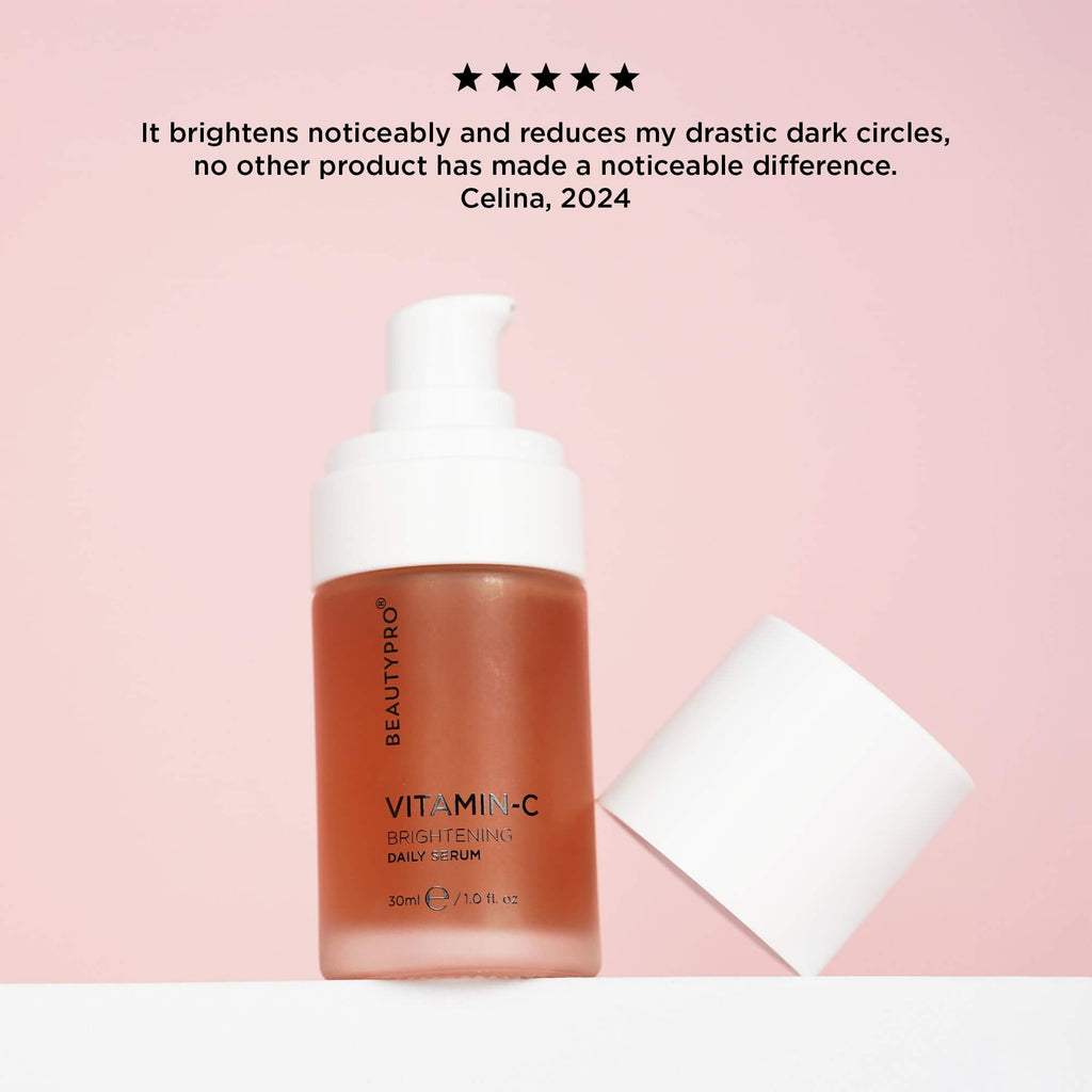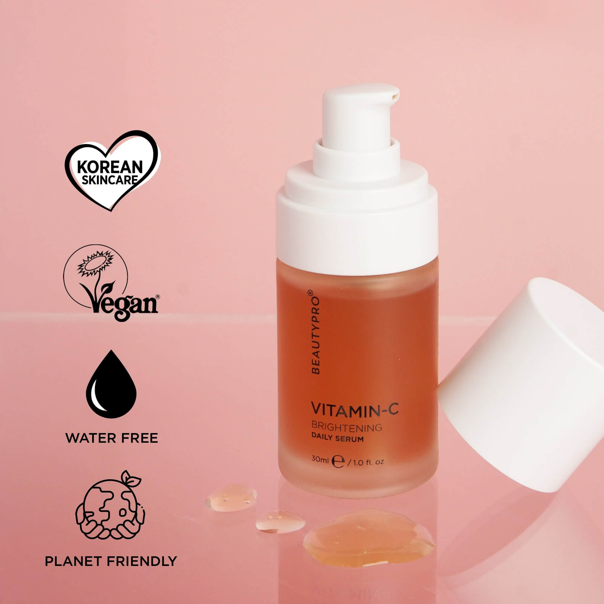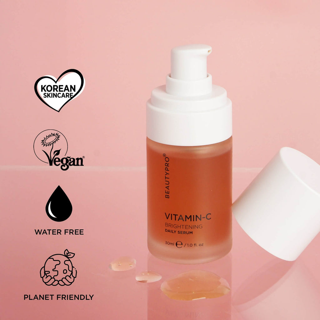 The BEAUTYPRO VITAMIN C Brightening Daily Serum is a plant-based formula enriched with Blueberry, Yuzu Citrus, and Sea Buckthorn, designed to support skin hydration, improve the appearance of skin elasticity, and enhance natural radiance.